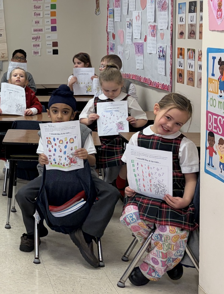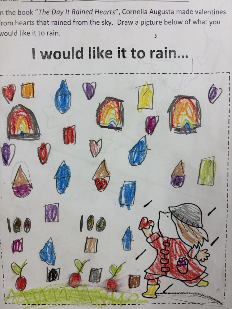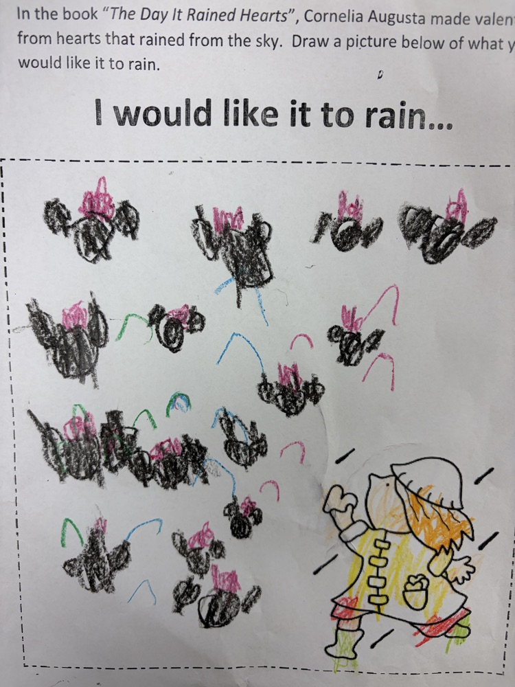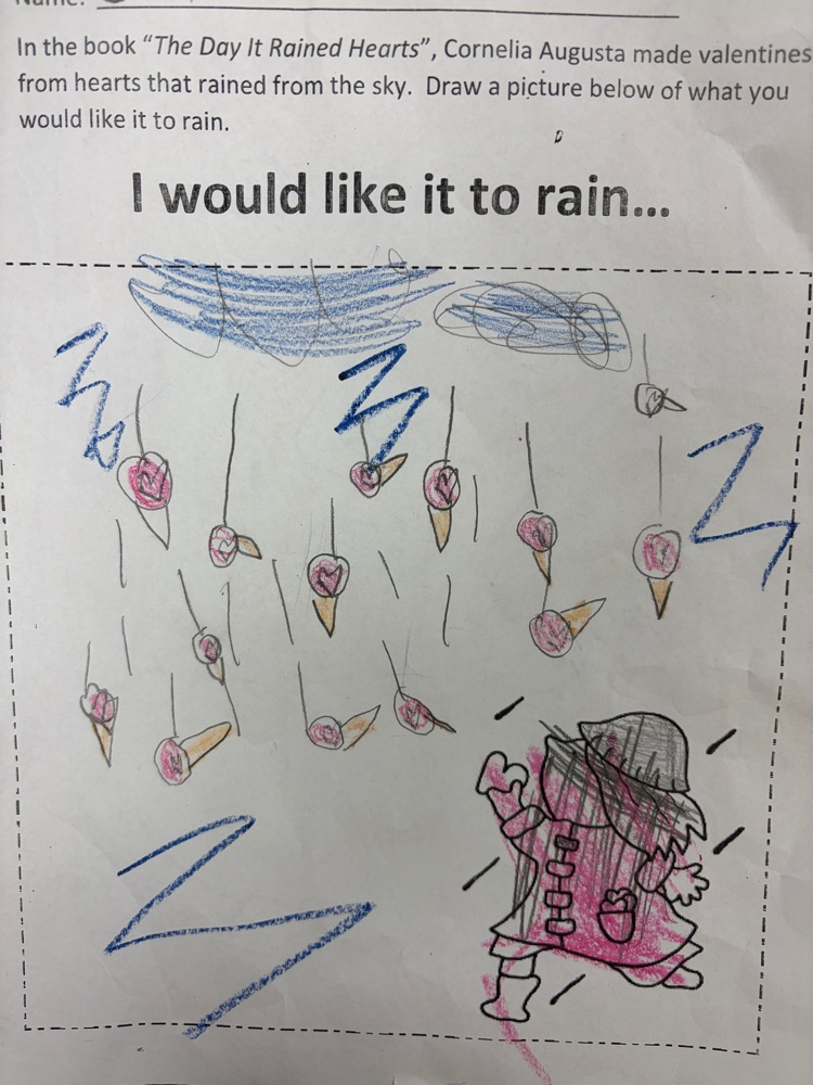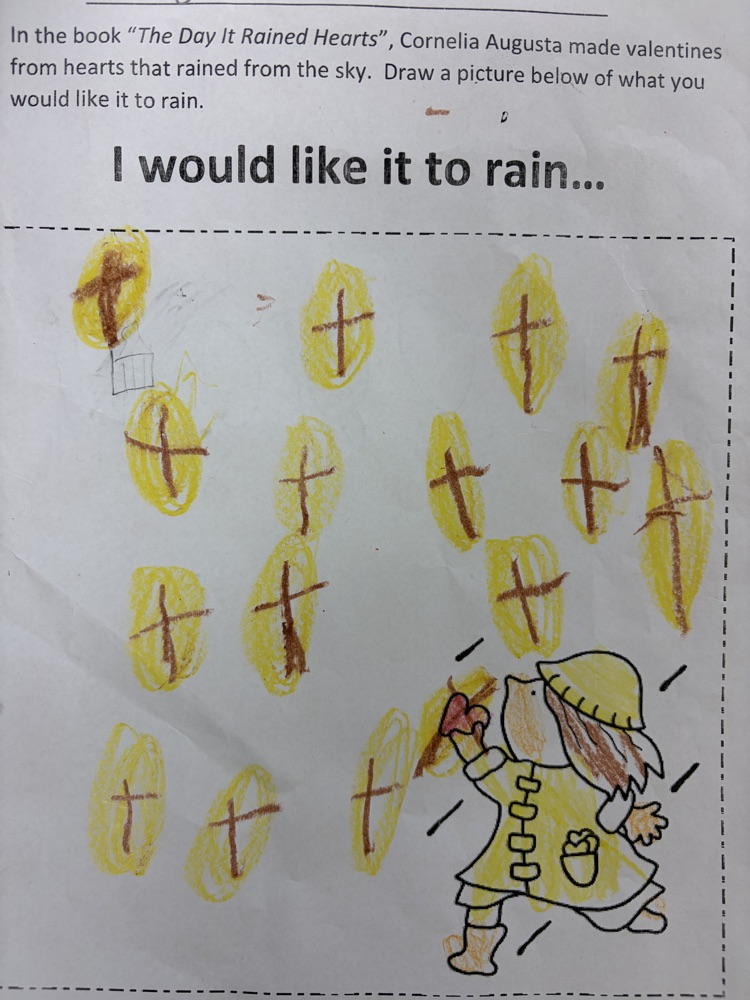 💕Today Mrs. Johnson’s Kindergarten class read a Valentine’s 💌Day story called, “The Day it Rained Hearts”. After they read the story, the children had to draw what they would want it to rain and share it with their classmates. Some of the students got creative with their ideas of ✝️crosses, 🍦ice cream cones, 🏰Minnie ears and 💵money. #SFCS