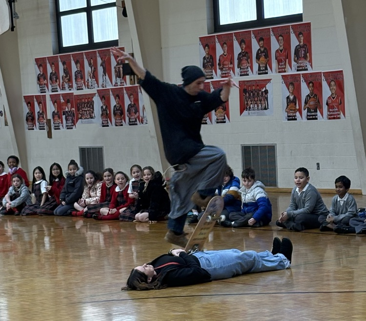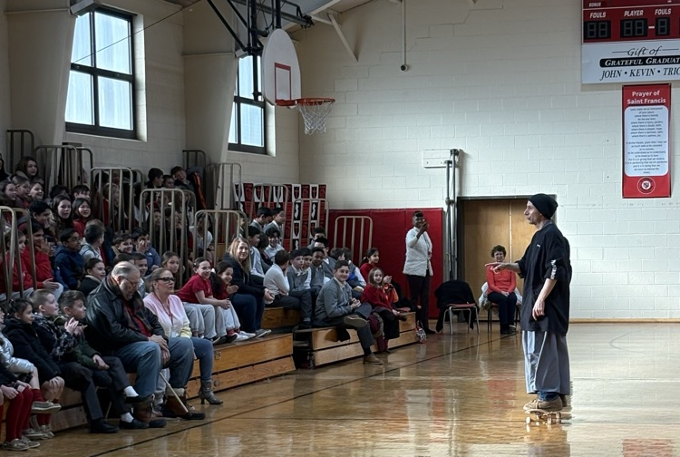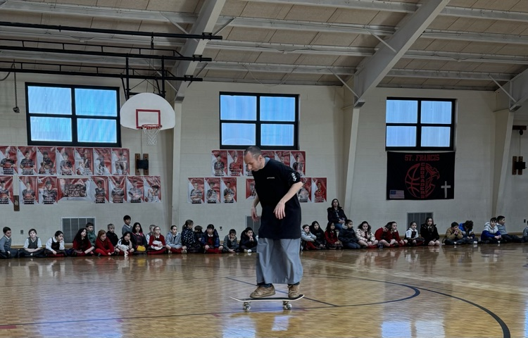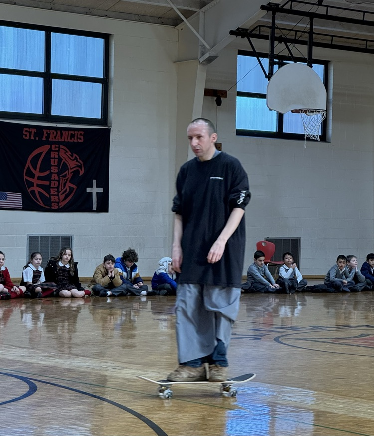 🤎Franciscan Friar, Brother Gabriel Cortez captivated our students this morning with his🛹skateboarding skills sharing his message of faith with our students. He performed daring feats with his skateboard jumping over our teachers to show the importance of trust in our faith journeys.✝️ #SFCS
